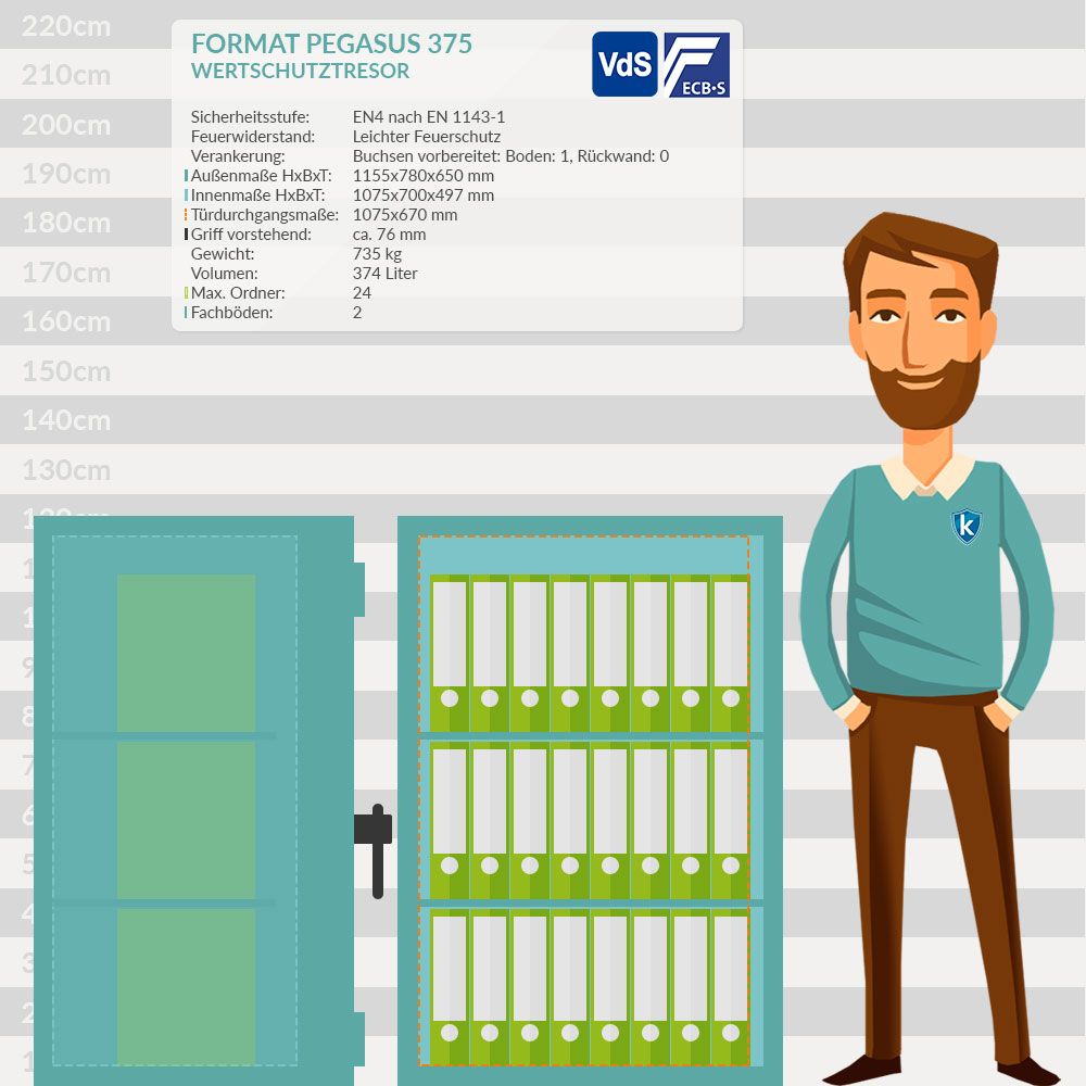 Der Format Pegasus verfügt über einen zertifizierten Widerstandsgrad von EN4 nach EN1143-1, geprüft von ECBS und VdS. Erstklassige Tresor-Qualität auf die Sie sich verlassen können. Vorbereitet auch zum Anschluss an eine Einbruchmeldeanlage (EMA).