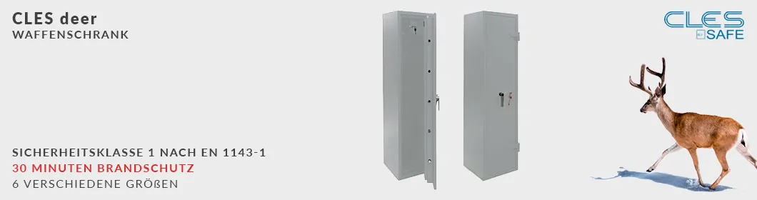 Der CLES deer besitzt zusätzlich noch einen geprüften Feuerwiderstand von 30 Minuten gemäß EN 15659 (LFS 30P). Speziell gefertigt für die Lagerung/Verwahrung von Langwaffen sowie Munition, sind diese Waffenschränke ideal für Jäger, Sammler, Vereine oder Sportschützen.