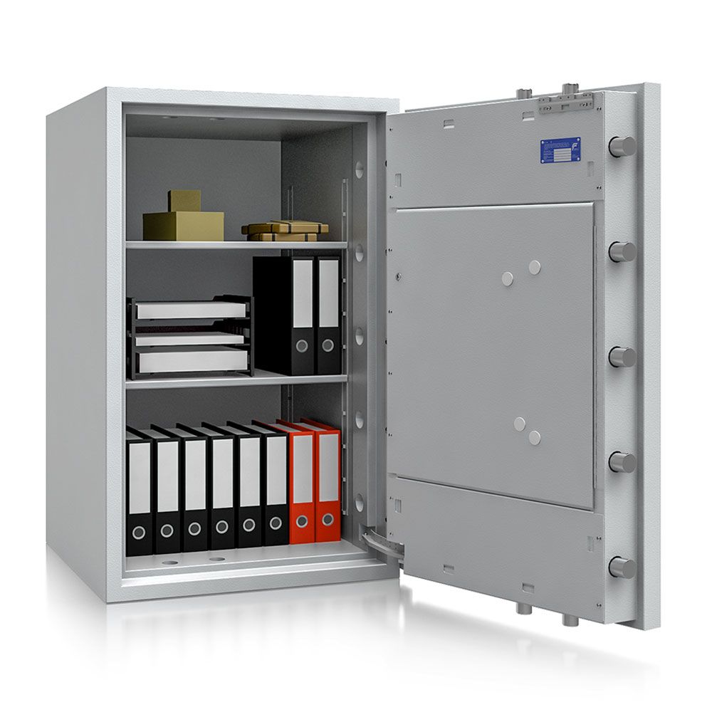 Durch die zertifizierte Sicherheitsstufe EN5 nach EN 1143-1 von ECB-S und VdS bietet dieser hochwertige Tresor einen sehr zuverlässigen Einbruchschutz. Die massive Bauweise, mehrwandiger Korpus und Türe, bieten hohe Sicherheit für Wertgegenstände und Dokumente.